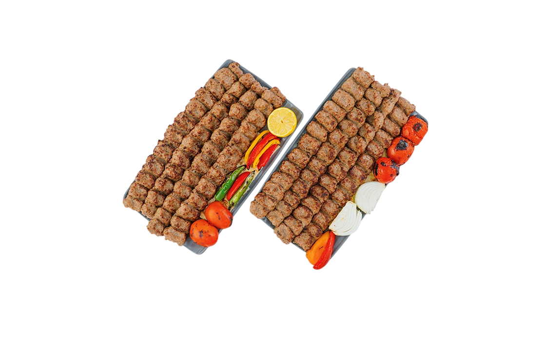 8 سیخ 210 گرمی گوشت خالص مخلوط گوسفند و گوساله همراه با گوجه، لیمو، سبزیجات کبابی