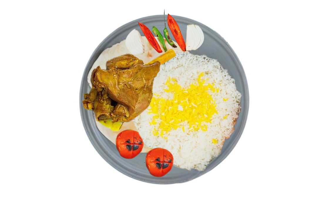 یک عدد ران مرغ 300 گرم به همراه برنج درجه یک ایرانی همراه با باقالی و شوید و گوجه ، لیمو ، سبزیجات کبابی