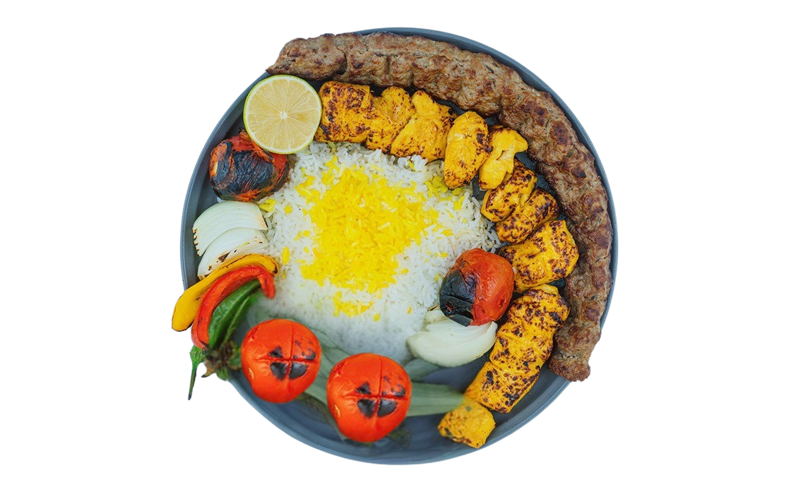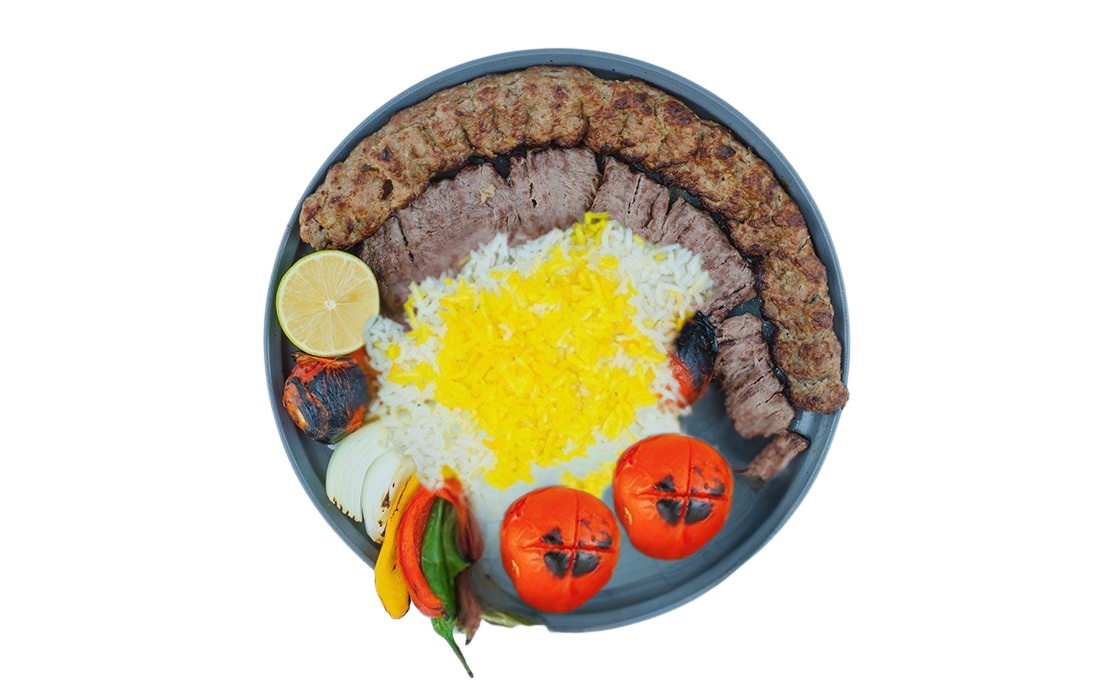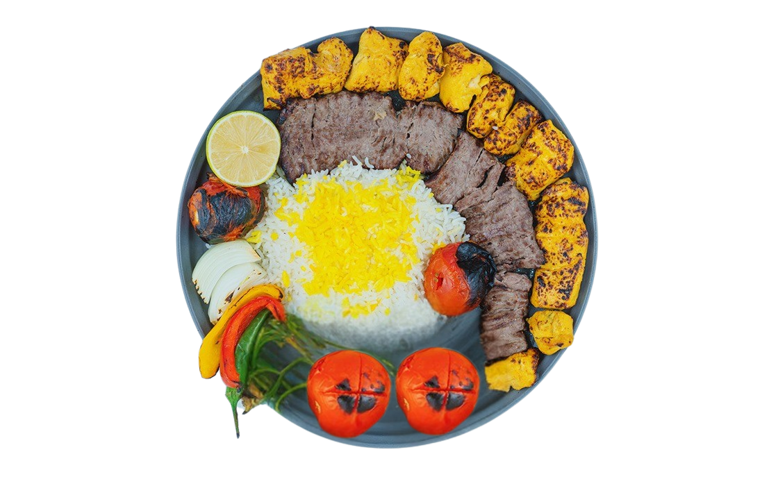 يک سيخ كباب برگ 300 گرم گوسفندى ويک سيخ جوجه كباب سينه زعفرانى 450 گرمی به همراه برنج درجه یک ایرانی (کشت دوم) همراه با گوجه ،لیمو ، سبزیجات کبابی