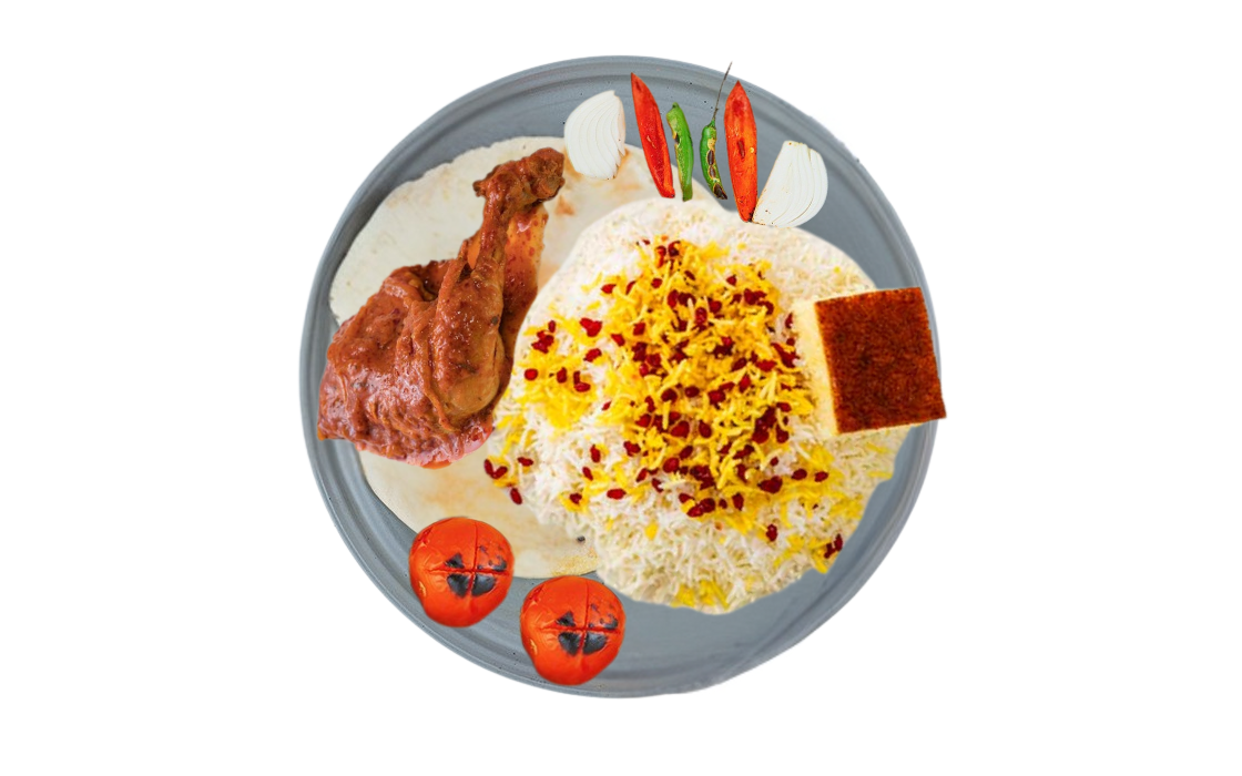 یک عدد ران مرغ 300 گرم به همراه برنج درجه یک ایرانی همراه با زرشک و گوجه ، لیمو ، سبزیجات کبابی