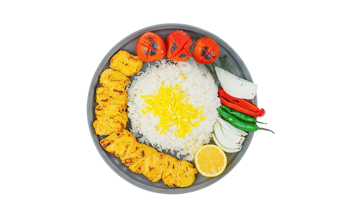 یک سیخ جوجه کباب ران 450گرم به همراه برنج درجه یک ایرانی همراه با گوجه ، لیمو ، سبزیجات کبابی