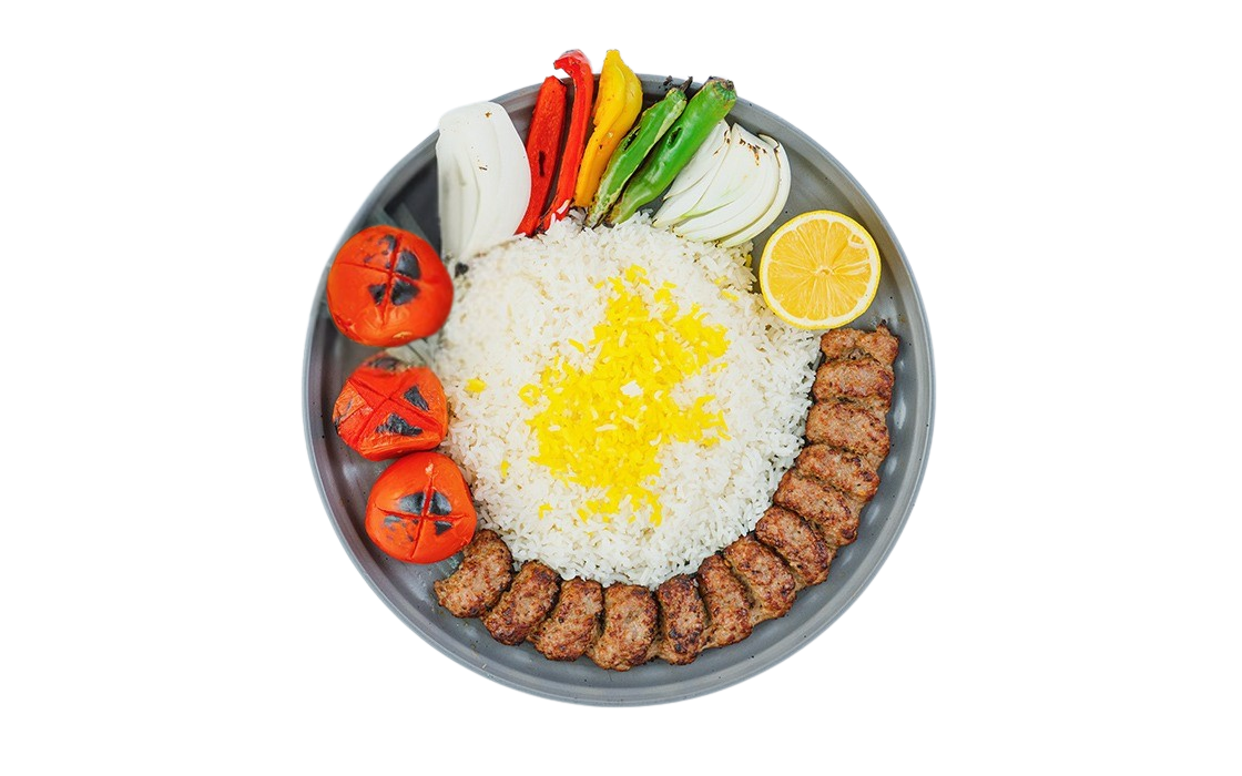 یک سیخ کباب کوبیده 210 گرم گوشت مخلوط گوسفند و گوساله به همراه برنج درجه یک ایرانی (کشت دوم) همراه با گوجه ، لیمو ، سبزیجات کبابی