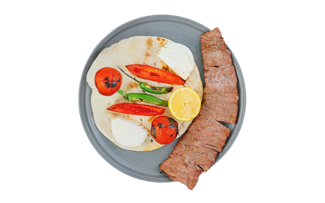 1 سیخ 210 گرمی گوشت مخلوط گوسفند و گوساله همراه با گوجه ، لیمو ، سبزیجات کبابی