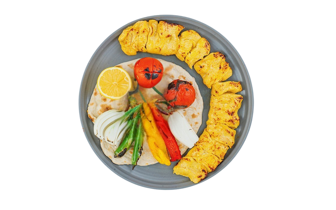 450 گرم جوجه کباب سینه زعفرانی بدون استخوان همراه با گوجه ، لیمو ، سبزیجات کبابی
