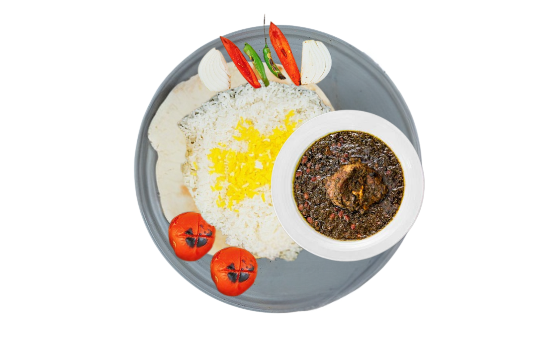 450 گرم قرمه سبزی با 95 گرم گوشت گوساله و لوبیا 80 گرم به همراه برنج درجه یک ایرانی (کشت دوم)